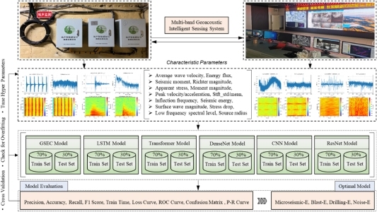 贵大新闻网讯(矿业学院)近期,贵州大学矿业学院左宇军教授领衔的矿山动力灾害预警与控制团队在矿山微震信号识别及处理技术领域取得重要研究成果。相关成果发表在国际顶级期刊 International Journal of Rock Mechanics and Mining Engineering (IF=7.0,中科院一区TOP期刊)和 Engineering Geology (IF=6.9,中科院一区TOP期刊)。论文第一单位为贵州大学,贵州大学矿业学院左宇军教授及省外高水平大学“组团式”帮扶专家、中南大学董陇军教授为论文通讯作者,王剑博士后为论文第一作者。微震活动是地下采矿环境中应力重分布、地质异常和潜在风险的关键指标。如何快速有效地识别微震事件,例如噪音、爆炸和钻孔活动,对于确定矿山的稳定性和安全性至关重要。研究成果系统开展了矿山微震信号识别及处理技术方面的研究,构建了K-means和高斯混合模型(GMM)相结合的聚类方法,对矿区微震信号进行时空聚类分析,确定了导致微地震事件的采矿相关活动,例如地应力重分布、矿石运输、爆破和钻孔;采用短时傅里叶变换(STFT)提取的频率平均值和标准差、