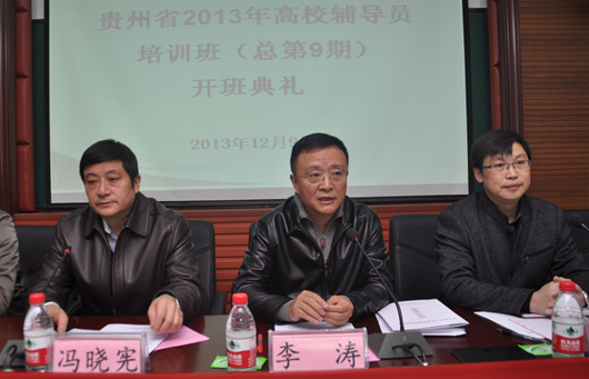 新闻网讯(记者 庞爱忠)12月9日,贵州省2013年高校辅导员培训班第九期开班典礼在我校逸夫楼322教室举行。省委教育工委副书记李涛,校党委副书记冯晓宪出席并讲话,来自全省44所高校的78名辅导员参加培训。校学生工作部(处)长肖建宗主持开班典礼。 省委教育工委副书记李涛讲话。他表示,学生进入大学,接受什么样的引导就会成长为什么样的人。辅导员既是学生的导师,又是学生的朋友,要解决好政治立场和方