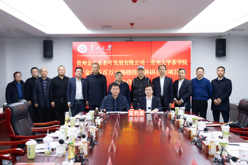 贵大新闻网讯(文字/宁玉梅 摄影/冯月成)12月16日,贵州金尘茶茶叶发展有限公司—贵州大学茶学院“金尘茶百万元揭榜挂帅科研合作项目”签约启动仪式在我校西校区举行。贵州省人大常委会原副主任、贵州省茶文化研究会会长、贵州大学茶学院战略发展委员会主任傅传耀,贵州大学校长宋宝安院士、副校长王锦荣,华兴控股集团总裁、贵州金尘茶茶叶发展有限公司董事长葛小松出席签约仪式。签约仪式由王锦荣主持。傅传耀对项目签约表示祝贺。他说,希望双方在未来的合作中,要聚焦产业发展需求,在人才培养、科技创新、品牌打造等方面开展深度合作,推动校企合作产学研融合发展,打造贵州“传统茶、新茶饮、抹茶”“三茶”新特色、新亮点、新名片。宋宝安表示,本次项目是深化校企合作服务贵州茶的重要举措。下一步,希望茶学院着眼于新质生产力,聚焦茶产业发展中的瓶颈难题,积极组织力量进行科技攻关,开展前沿探索创新,不断适应新业态对茶产业发展的新要求,助力贵州茶产业高质量发展。会上,双方就此次合作进行研讨和交流。葛小松表示,希望通过实施“金尘茶百万元揭榜挂帅科研合作项目”,积极参与科研合作、人才培养,以科技创新提升企业竞争力,助推中国茶产业升级,
