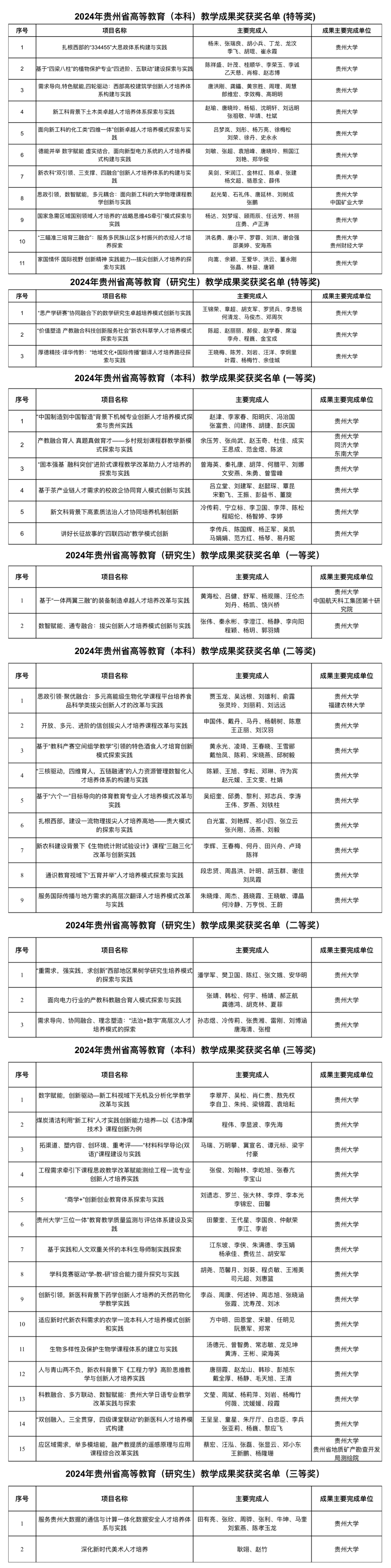 贵大新闻网讯(学生记者 杨贵珠)近日,贵州省教育厅发布了《省教育厅关于公布2024年贵州省高等教育省级教学成果奖获奖名单的通知》,我校共51项教学成果获奖(其中本科教育41项、研究生教育10项)。