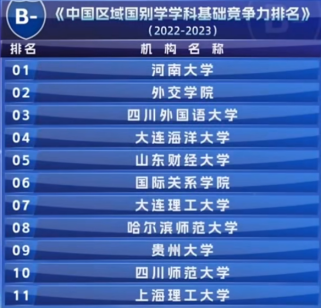 贵大新闻网讯(东盟研究院)近日,高校区域国别学人才培养与学科建设联盟(简称“高盟”)完整公布《中国区域国别学学科基础竞争力百强排名(2022—2023)》,贵州大学凭借其在东南亚研究中扎实的学科基础以及积极的创新实践,成功入选全国百强榜单并获评“B-”等级,成为贵州省唯一跻身该榜单的单位,标志着我校区域国别学学科建设进入西部高校前列,彰显了我校在新兴学科建设领域的阶段性成果。