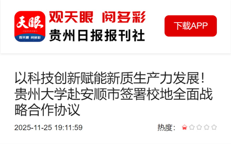 受贵州大学校党委书记杨未、校长宋宝安院士委托,陈祥盛向安顺市委市政府长期关心支持学校发展致以诚挚感谢。他表示,校地深化合作紧扣国家及贵州省制造业中试平台建设部署,将为贵州高端装备制造业转型升级、全省中试平台建设提供示范。贵州大学将整合材料、机械、大数据等学科创新资源,推动平台实体化运作,联合相关单位共建共享,打造高质量发展“生力军”,以科技创新赋能新质生产力发展。