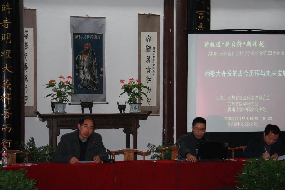2010年11月27日下午,贵州省儒学研究会在贵州大学中国文化书院举办了2010年学术年会,年会主题为“西部大开发的古今历程与未来发展”,年会同时亦是2010年贵州省社会科学学术年会第23分会场。年会由儒学研究会秘书长龚晓康、副秘书长黄诚主持。