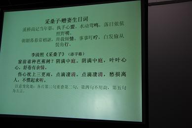 王教授先从词的起源引入,接着分别从填词的关键、词的音乐性、词调、音节、平仄、词的结构、上下片的承转、词的意境来谈如何作词、如何以清丽的语言营造一种清雅悠远的意境。如果说王教授字字如珠玑,那他丰富的人生经历就如一根线把这粒粒珍珠串连起来。虽然他谈的是作词的技巧,但贯穿其中的却是浓浓的情,其“下笔匆匆,驭电追风。顺心事,何费天公…”抒发的是书生意气风发的豪情;“月影轻摇海月烟,山增懵懂水极天。礼花争献胭脂色,楼宇妆成雾里仙。星似雨,落人间,诗情裹梦上笺端。窃攀小晏乏词魄,半醉含毫对玉盘”写意的是词者欲与小晏试比高的理想;“溪桥尚记当年影,执手心盟,水动莺鸣,落日依依照月明。朝朝暮暮常相谑,卅载倾情。事事叮咛,白发偷从鬓角行”表达的是作为才子的怜香惜玉的柔情和作为丈夫对妻子疼爱呵护的款款深情……