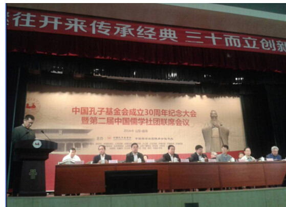 2014年9月20日,在孔子诞辰2565周年到来之际,中国孔子基金会成立30周年大会暨第二届中国儒学社团联席会议在山东曲阜孔子研究院召开。来自全国各省的知名专家学者、各省市自治区、港澳台及海外儒学团体负责人共150多位代表参加会议。贵州大学中国文化书院荣誉院长张新民教授应邀出席了此次大会,并为大会作“人类良知的现代性处境及其拯救之路”专场演讲。