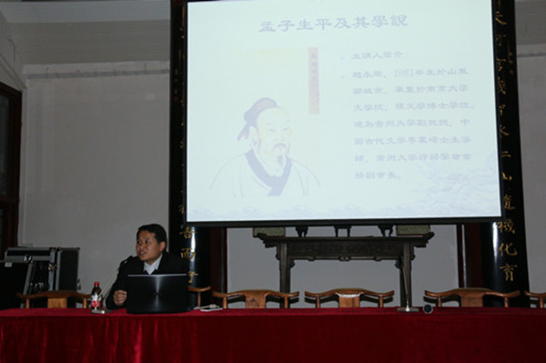 2014年11月28日晚,挂靠贵州大学中国文化书院的学生社团“汉风府”,在北校区中国文化书院举行了关于“孟子生平及其学说”的主题讲座。主讲人是中国古代文学专业硕士生导师、我校诗词学会常务副会长赵永刚副教授。