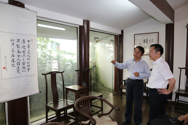 南京医科大学客人一行参观了书院孔子铜像、勉学堂、励道楼、合一亭、仁文厅等处。夏副校长饶有兴致地就贵州大学中国文化书院的学术研究、文化承载与传播等进行详细了解并提出了相关疑惑,张清常务副院长一一进行了回答和解释。