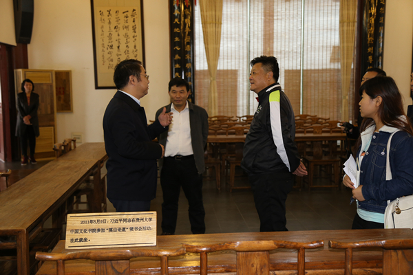 骆长江在汇报中介绍到,近年来学校注重特色文化品牌和文化特别景观建设,不断丰富和深化校园文化内涵,以特色校园文化建设引领学生成长成才、营造精神文化家园;贵州省优秀校园文化育人基地——中国文化书院始建于2002年。2011年5月,习近平同志莅临贵州大学中国文化书院,参加“我读《大学》——以‘五四精神’解读‘修齐治平’的当代价值”师生读书会活动并发表重要讲话,提出要传承和弘扬中华优秀传统文化;贵州大学广大师生牢记总书记谆谆嘱托,以中国文化书院等文化载体为依托,通过传承和弘扬中华优秀传统文化等方式和手段,实现校园文化育人。