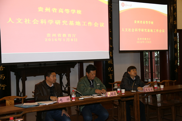 2016年1月8日,由贵州省教育厅主办、贵州大学哲学社会科学研究院承办、贵州大学中华传统文化与贵州地域文化研究中心协办的全省高校人文社科基地研讨会在贵州大学中华传统文化与贵州地域文化研究中心(中国文化书院)举行。贵州省教育厅党组成员、省委教育工委副书记、厅机关党委书记赵廷昌,贵州大学副校长、中国工程院院士宋宝安教授出席研讨会,向研讨会致词并发表讲话。来自省教育厅所属全省各高校人文社会科学研究基地负责人、各高校科研处处长、各高校相关学院院长,就研究基地相关工作展开研讨。贵州省教育厅社政处主持工作副处长赵祥主持会议。