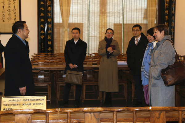 2016年1月12日,英国驻重庆总领馆文化教育领事朗晨(Dawn Long)女士率英国文化教育协会考试部主任李永明女士、英国总领事馆文化教育处西南区副主任陈兵先生等一行参观贵州大学中国文化书院。贵州大学国际交流与合作处处长洪云、副处长谢明英陪同参观。