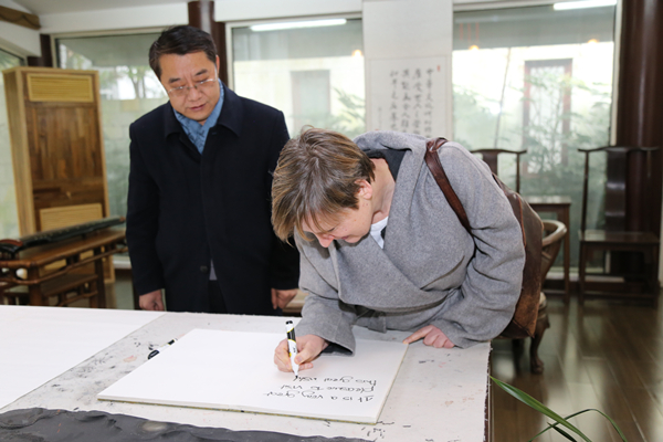 贵州大学中国文化书院常务副院长张清教授对朗晨女士一行到来表示热烈欢迎,向客人简要介绍了中国文化书院及以儒学等为代表的中国优秀传统文化相关情况,带领客人一行参观了书院勉学堂、孔子圣迹图、游艺轩、励道楼、琴轩、研究成果陈列室、阳明文化石刻、合一亭、涵远读书楼、传习室、仁文厅等。参观结束,朗晨女士在仁文厅签名并留言,表达对中国文化书院的美好祝愿。