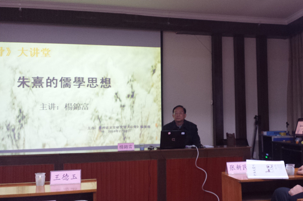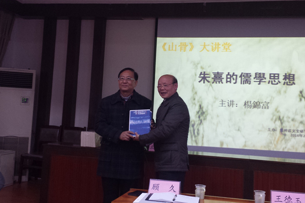 2016年2月19日,贵州省文史研究馆“《山骨》大讲堂”举行首次学术报告会,特邀台湾学者杨锦富教授主讲“朱熹的儒学思想”并展开相关学术交流。贵州大学中国文化书院荣誉院长张新民教授、常务副院长张清教授、王胜军副教授,贵州大学中国文化书院兼职副研究员、人文学院张明副教授及王进副教授应邀参加。