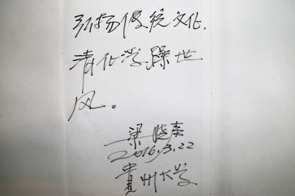交流结束前,中国文化书院常务副院长张清教授向梁晓声教授赠送中国文化书院最新出版的传统文化大型连续学术辑刊《阳明学刊》第七辑、《人文世界》第六辑。梁晓声教授欣然题写“弘扬传统文化清化浮躁世风”赠与贵州大学中国文化书院。