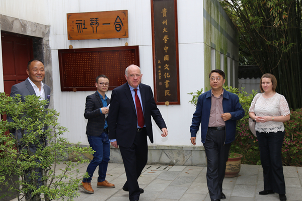 会见后,中国文化书院负责人带领客人参观了中国文化书院,向客人简要介绍了中国优秀传统文化的基本内涵。参观中,当了解到国家主席习近平在文化书院与师生座谈的情况时,菲利普·史密斯愉快地回忆了习近平主席访问爱尔兰时到香侬酒店管理学院视察的情形,畅谈了中爱友谊与合作。参观结束,史密斯校长在书院仁文厅提笔留言,表达对贵州大学的感谢与祝愿。