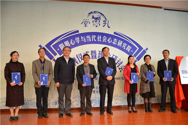 何力副省长与孔学堂负责人向研究院院长、副院长、秘书长及学术顾问颁发了聘书。浙江省儒学学会执行会长吴光以及浙江省社会科学院钱明研究员、华东师范大学杨国荣教授、四川大学舒大刚教授、复旦大学吴震教授、贵阳学院王晓昕教授等近百名全国阳明学、心理学、社会学等领域的知名学者共同见证揭牌仪式并出席理论研讨会。