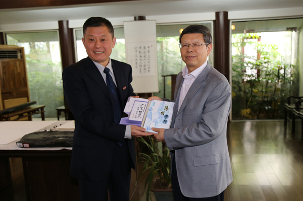 在书院仁文厅,常务副校长王红蕾等校领导与刘正东副主席就两校的建设与发展相关问题进行交流座谈。刘正东副主席对贵州大学高度重视中华优秀传统文化及校园文化建设的相关作为予以高度评价。王红蕾常务副校长向刘正东副主席赠送中国文化书院最新出版的中国传统文化研究大型学术缉刊《阳明学刊》、《人文世界》。