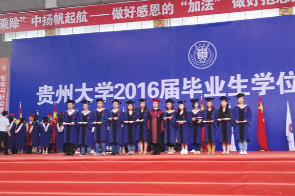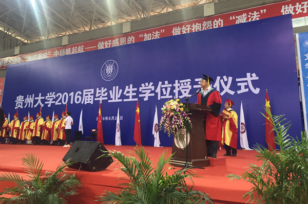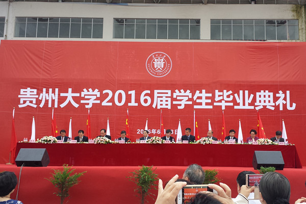 2016年6月28日,贵州大学2016届学生毕业典礼暨学位授予仪式在北校区体育场及体育馆隆重举行。全体校领导、学校各职能部门及各学院主要负责人,教师代表、家长代表,各学院博士、硕士及本科毕业生参加毕业典礼。校党委书记陈坚为优秀毕业生赠送礼物,校长郑强寄语2016届毕业生,优秀毕业生代表、毕业生家长代表先后发言。