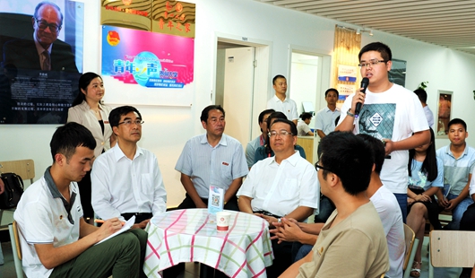 “青年之声·贵州大学”工作室正在举行“遇见”系列活动之“工科男遇见经管女”学习在路上主题研讨活动。秦宜智书记走进“青年之声”工作室,看到正在工作的同学们,与同学们进行亲切谈话。他说:“你们做得十分好,贵州大学在全国经验交流会上作了典型发言。请你们谈谈怎么办好青年之声,更好地为青年发声”。同学们踊跃发言,有的希望壮大学生队伍,有的希望多开点第二课堂课程。听了同学们的发言,校长郑强表示,贵大党委、行政一定会高度重视共青团工作和青年声音,“青年有所需、党政有所应”,努力把青年之声建设好。