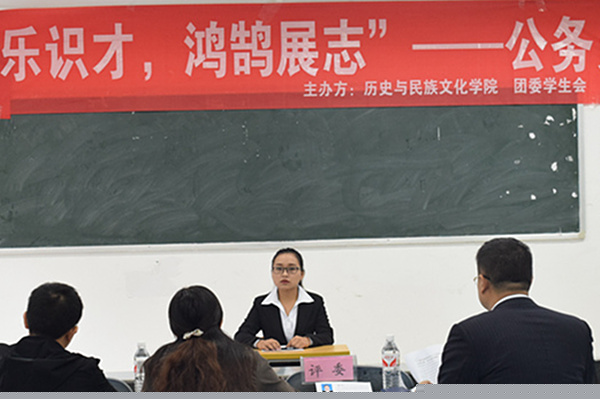 为做好我院大学生就业指导工作,进一步增强学生应聘面试能力,提升就业竞争力。11月6日,历史与民族文化学院首届“伯乐识才·鸿鹄展志”模拟应聘大赛在博学楼顺利举行。本次活动由贵州大学历史与民族文化学院团委主办,历史与民族文化学院学生会承办,贵阳银行云岩区分行赞助。大赛邀请了历史与民族文化学院夏保国教授、吴倩华副教授、闫平凡副教授、栾成斌老师、贵阳银行云岩区分行副行长闫行长一行3人、贵州省烟草专卖局人事处劳动关系管理员徐江及学院三名优秀研究生担任嘉宾评委。