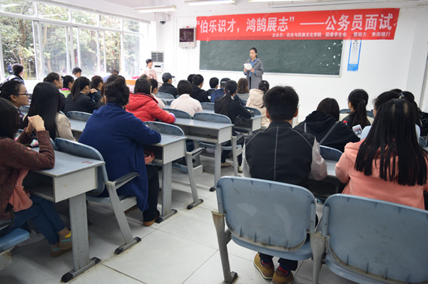 接下来,贵阳银行的闫行长跟同学们进行交流,他认为学习历史学的同学,有深厚的知识积淀,应将大学所学历史专业知识运用到求职之中,展现历史学子的风范。贵阳银行零售部李老师就同学们简历模板和自我介绍内容提了几点建议。来自贵州省烟草专卖局的徐江老师以国企为例,跟同学们分享了国企面试的常见形式、流程及面试时的注意事项。“国企的面试非常注重个人的政治面貌和品德,参加国企面试必须着装得体,有优良的品性。”