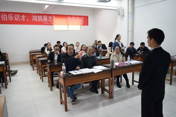 教师面试采取试讲方式,面试者在候场区签到之后,由工作人员依次带往面试区进行面试。选手在进行1分钟以内的自我介绍后,就个人准备课程内容进行8分钟以内的试讲,试讲结束后,由评委老师点评,每三人为一轮由主持人公布分数。