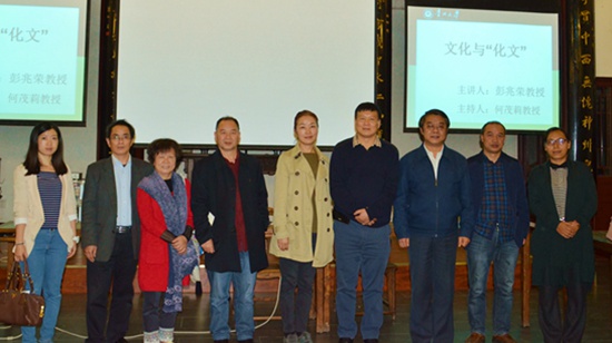 贵州大学新闻网2016年11月21日报道,11月19日晚,贵州大学历史与民族文化学院“贵山论坛”第108期之“文化与‘化文’”在中国文化书院勉学堂举行。论坛由厦门大学彭兆荣教授担任主讲,贵州大学历史与民族文化学院(中国文化书院)副院长何茂莉主持。