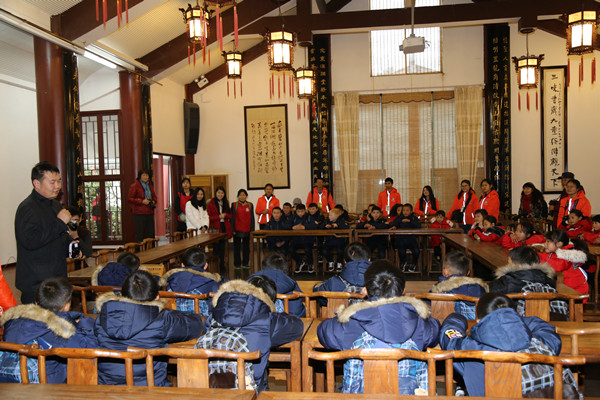 2016年12月23日上午,在贵州大学学生工作处师生事务服务中心和贵阳明彻助学中心志愿者的带领下,来自贵州省遵义市桐梓县新站镇和林小学的三十余名山区孩子参观贵州大学中国文化书院。