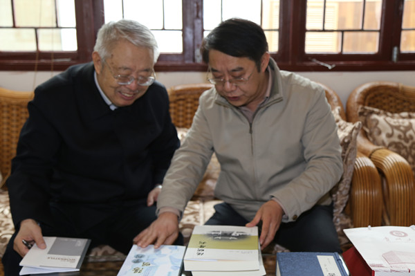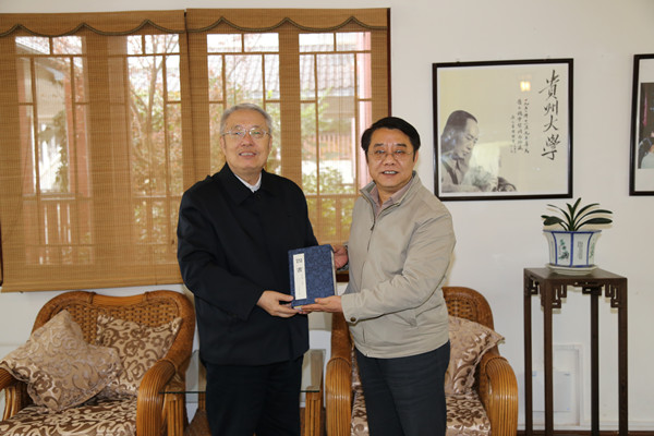 在书院仁文厅,刘兆伟教授向中国文化书院赠送由其译注的“中国教育名著丛书”《论语》、《孟子》、《大学》、《中庸》并在仁文厅提笔赠言:“贵州大学中国文化书院令世人沐浴优秀传统文化春风,助推酿制国家正能量,功莫大焉,敬甚敬甚。”张清教授向刘教授回赠中国文化书院新近编辑出版的学术辑刊《阳明学刊》及《人文世界》。