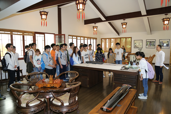 在琴轩,两位老师介绍道,中国文化历来认为必须舍理安顿人之性情,务必畅通渠道促使其感兴抒展,可以为歌,亦能成诗,化为艺术的天地,变为人格的风姿。人的生命可以升化为艺术,艺术亦能庄严人的生命。在中国传统文化中,琴棋书画既是文人雅士表达艺术境界的重要方式,又是士大夫群体人格精神定位的符号象征。提示同学们只有首先做到“修身”并争取达成生命的艺术境界,才能渐次实现“齐家、治国、平天下”的远大理想。