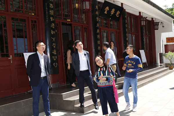 贵州大学中国文化书院办公室负责人及办公室助理在书院大门外欢迎香港客人的到来,向客人介绍了中国文化书院的相关情况并带领客人参观了象征中华传统文化“仁爱、中正、和谐、正义”精神的孔子铜像、体现贵州教育文化源远流长的东汉时期贵州教育文化鼻祖尹珍塑像、贵州大学前身清代时期“贵山书院”石刻。