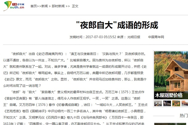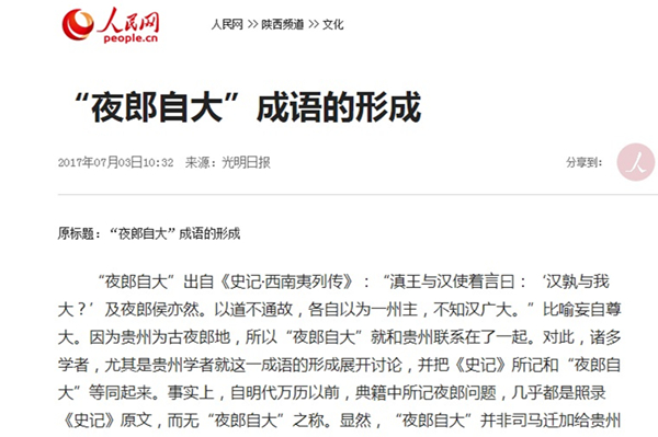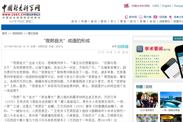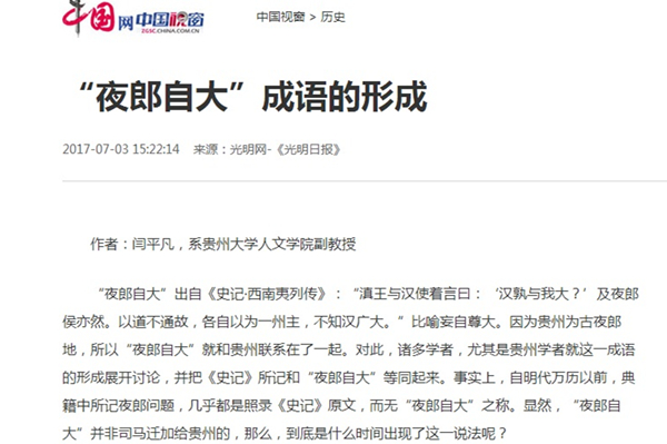 2017年7月3日,《光明日报》第13版“文史哲周刊”栏目刊载贵州大学历史与民族文化学院(中国文化书院)历史系副教授闫平凡(原贵州大学人文学院副教授)文章,题:“夜郎自大”成语的形成。