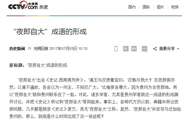 “夜郎自大”出自《史记·西南夷列传》:“滇王与汉使着言曰:‘汉孰与我大?’及夜郎侯亦然。以道不通故,各自以为一州主,不知汉广大。”比喻妄自尊大。因为贵州为古夜郎地,所以“夜郎自大”就和贵州联系在了一起。对此,诸多学者,尤其是贵州学者就这一成语的形成展开讨论,并把《史记》所记和“夜郎自大”等同起来。事实上,自明代万历以前,典籍中所记夜郎问题,几乎都是照录《史记》原文,而无“夜郎自大”之称。显然,“夜郎自大”并非司马迁加给贵州的,那么,到底是什么时间出现了这一说法呢?