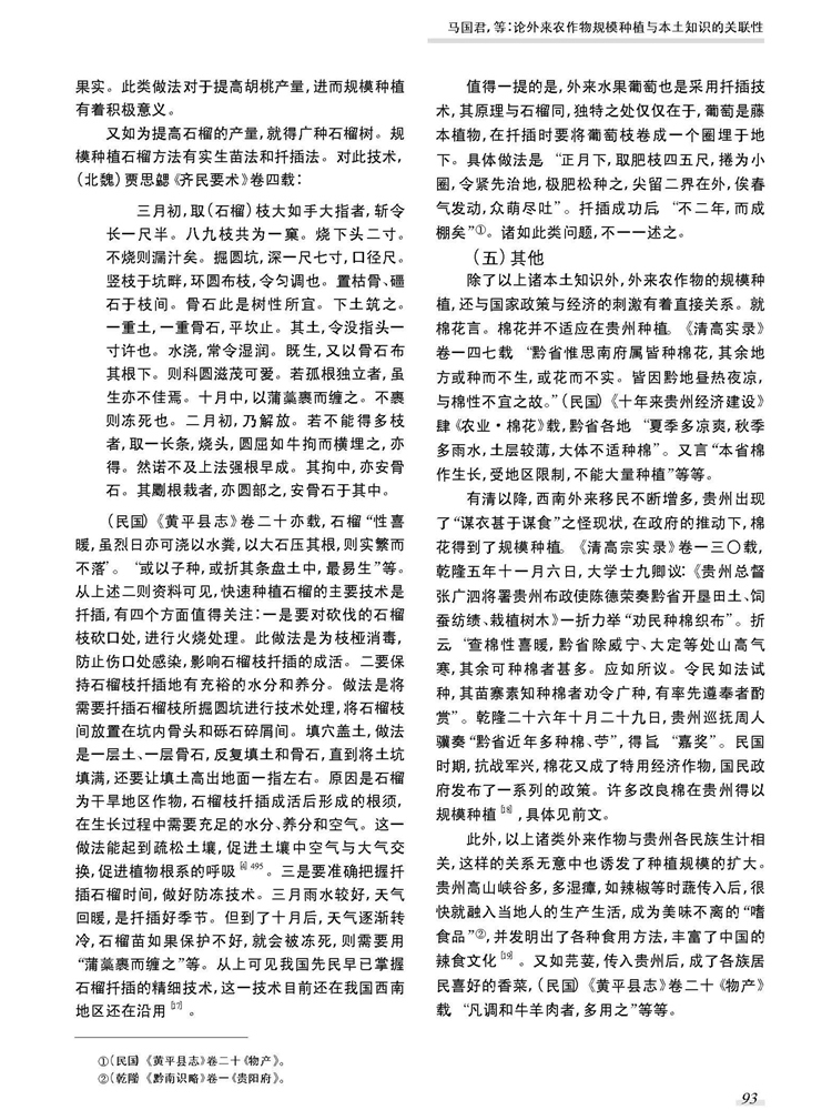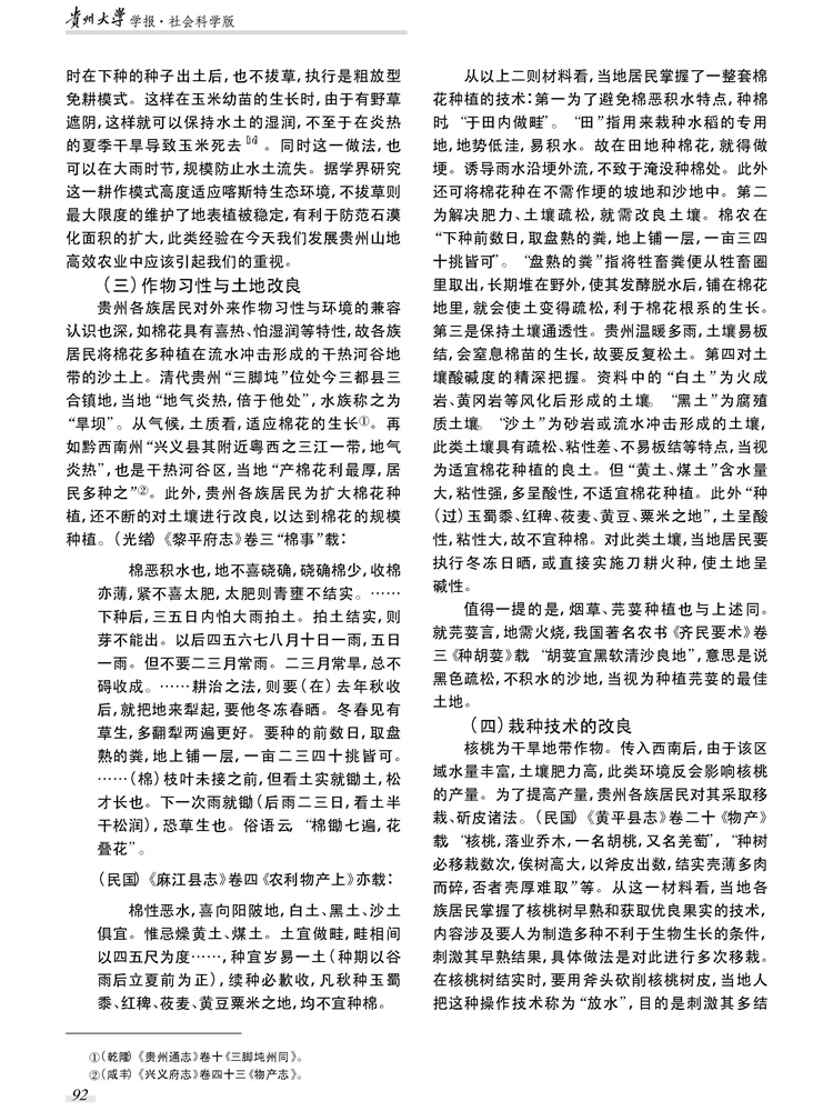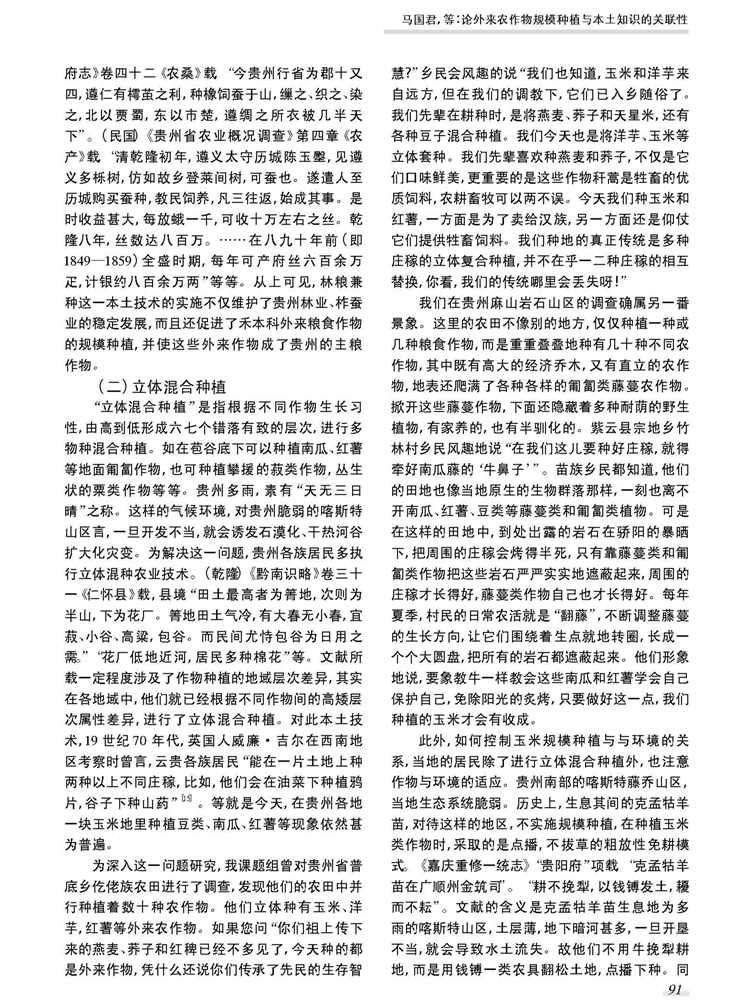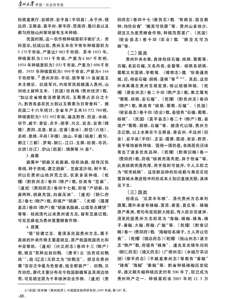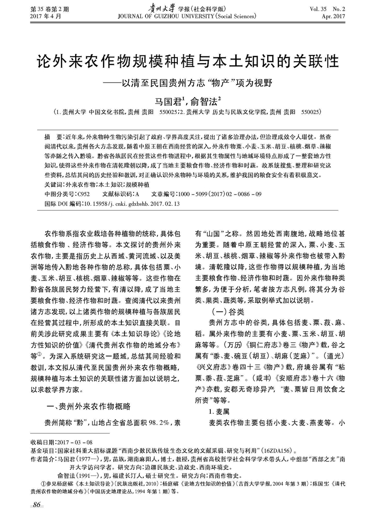 2017年4月第35卷第2期《贵州大学学报》(社会科学版)刊载贵州大学历史与民族文化学院(中国文化书院)马国君教授及中国史专业硕士生俞智法论文,题:论外来农作物规模种植与本土知识的关联性——以清至民国贵州方志“物产”项为视野。全文如下: