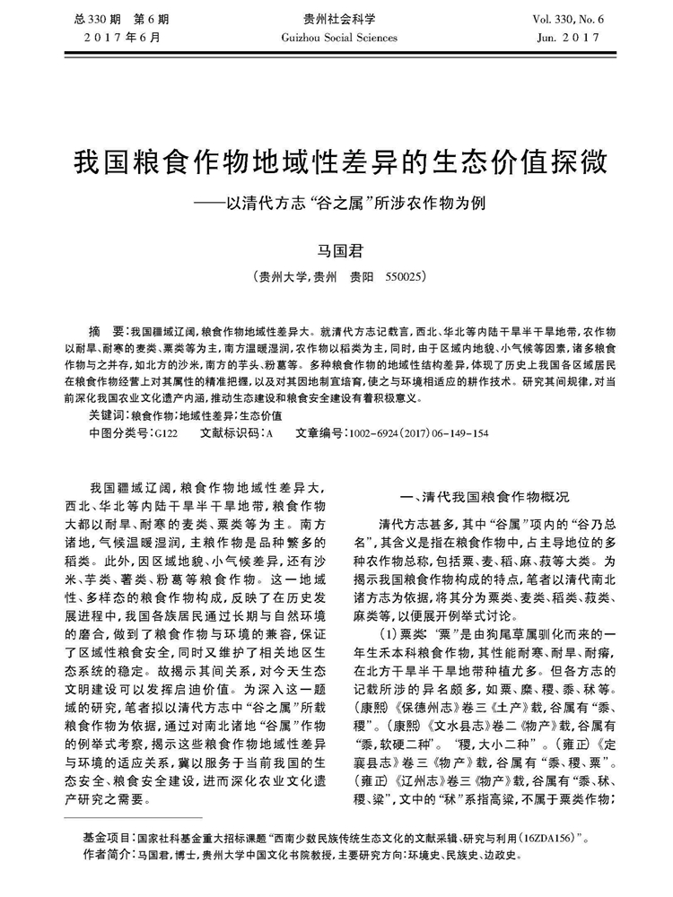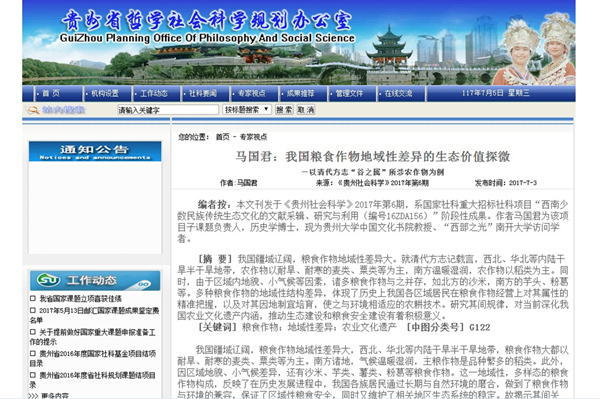 2017年6月总330期、第6期《贵州社会科学》刊载贵州大学历史与民族文化学院(中国文化书院)马国君教授论文,题:我国粮食作物地域性差异的生态价值探微——以清代方志“谷之属”所涉农作物为例。2017年7月3日,贵州省哲学社会科学规划办公室网站《专家视点》栏目全文转载。全文如下: