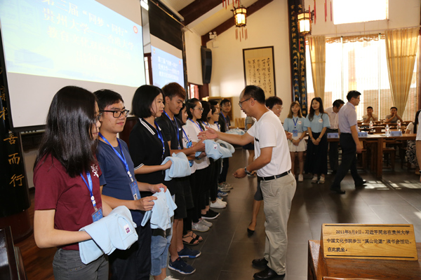 贵大老师向香港大学志愿者赠送活动文化衫,两校志愿者互赠纪念品。香港大学学生代表黄皓芊,贵州大学学生代表周佳颖发言。