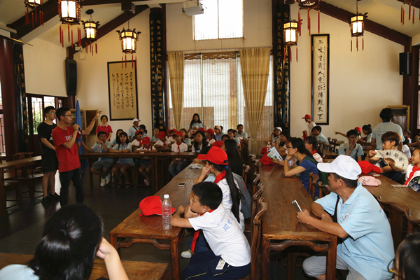 2017年7月24日下午,在贵州大学党委宣传部副部长石明昌老师带领下,参加由校党委宣传部承办的“同梦·同行”第三届贵州大学-香港大学教育文化双向交流活动的贵州大学、香港大学学生志愿者,以及两校志愿者开展暑期支教活动的贵州省榕江县寨蒿镇太平小学师生来到贵州大学中国文化书院参观。书院办公室工作人员在书院大门外热烈欢迎贵港两校学生志愿者及太平小学师生一行。