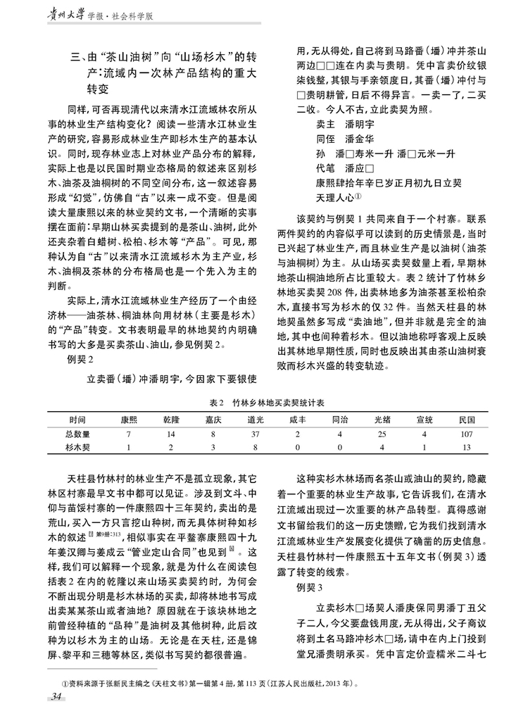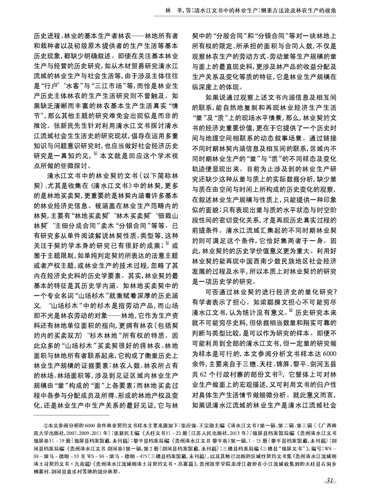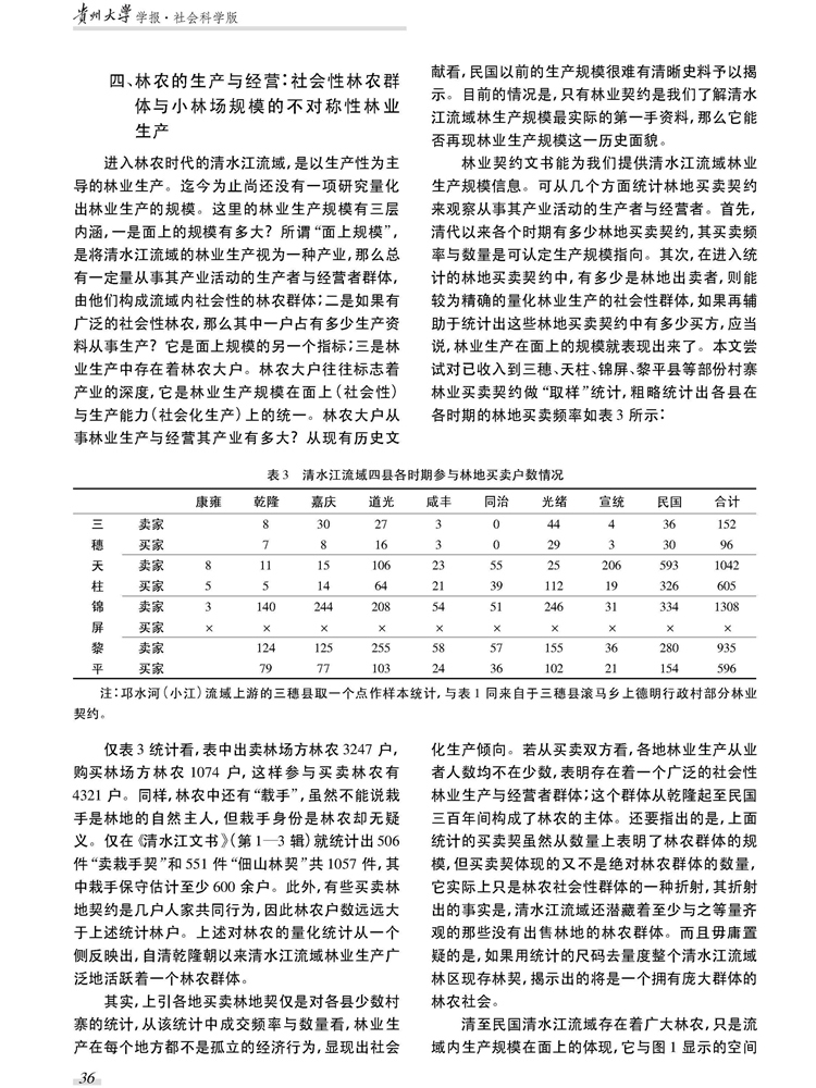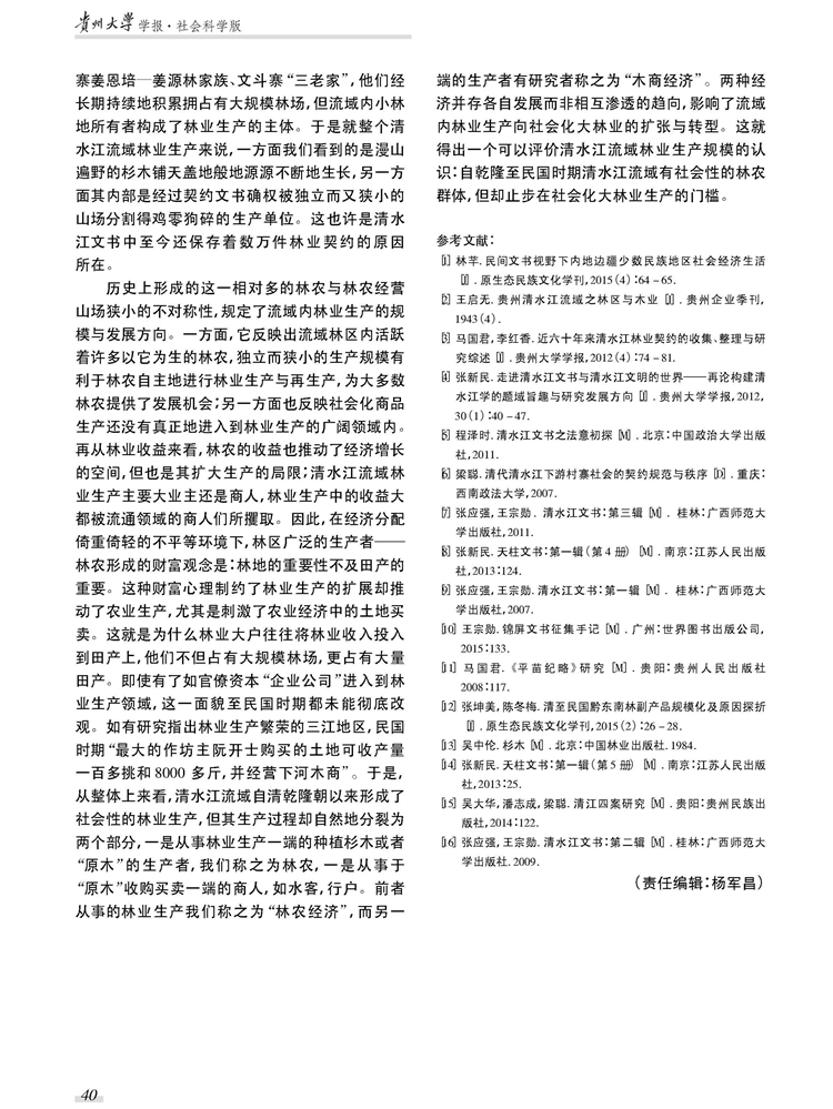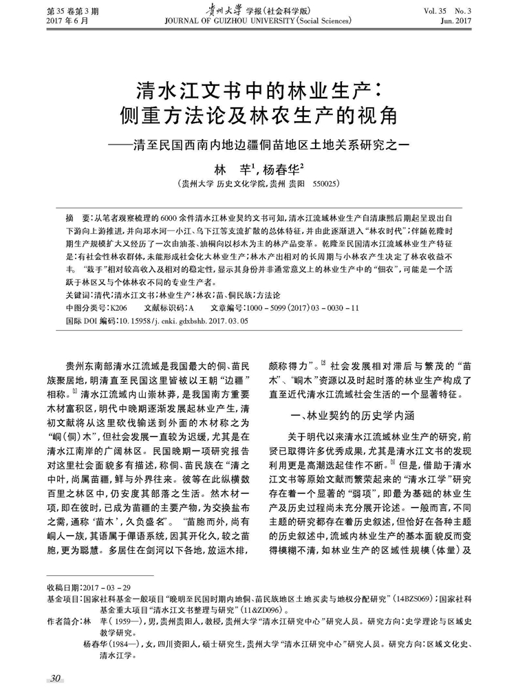 2017年6月第35卷第3期《贵州大学学报》(社会科学版)刊载贵州大学历史与民族文化学院(中国文化书院、阳明文化研究院)贵州大学清水江学研究中心研究员、历史系林芊教授及硕士生杨春华“清水江学”研究论文,题“清水江文书中的林业生产:侧重方法论及林农生产的视角——清至民国西南内地边疆侗苗地区土地关系研究之一”。全文如下: