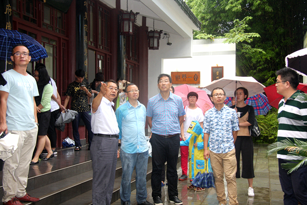 在书院大门,张清教授为绍兴职业技术学院鲍贤杰院长一行介绍了传达仁爱与和谐精神的孔子塑像、贵州汉文化教育的传播者、贵州教育文化鼻祖——尹珍先生塑像以及见证贵州大学百年发展历史的“贵山书院”石刻,介绍中国哲学史界泰斗任继愈先生及孔子第七十七代嫡传后人“衍圣公”孔德成先生题赠“中国文化书院”院名匾额及其所蕴含对中华优秀文化传承与弘扬的殷切希望。