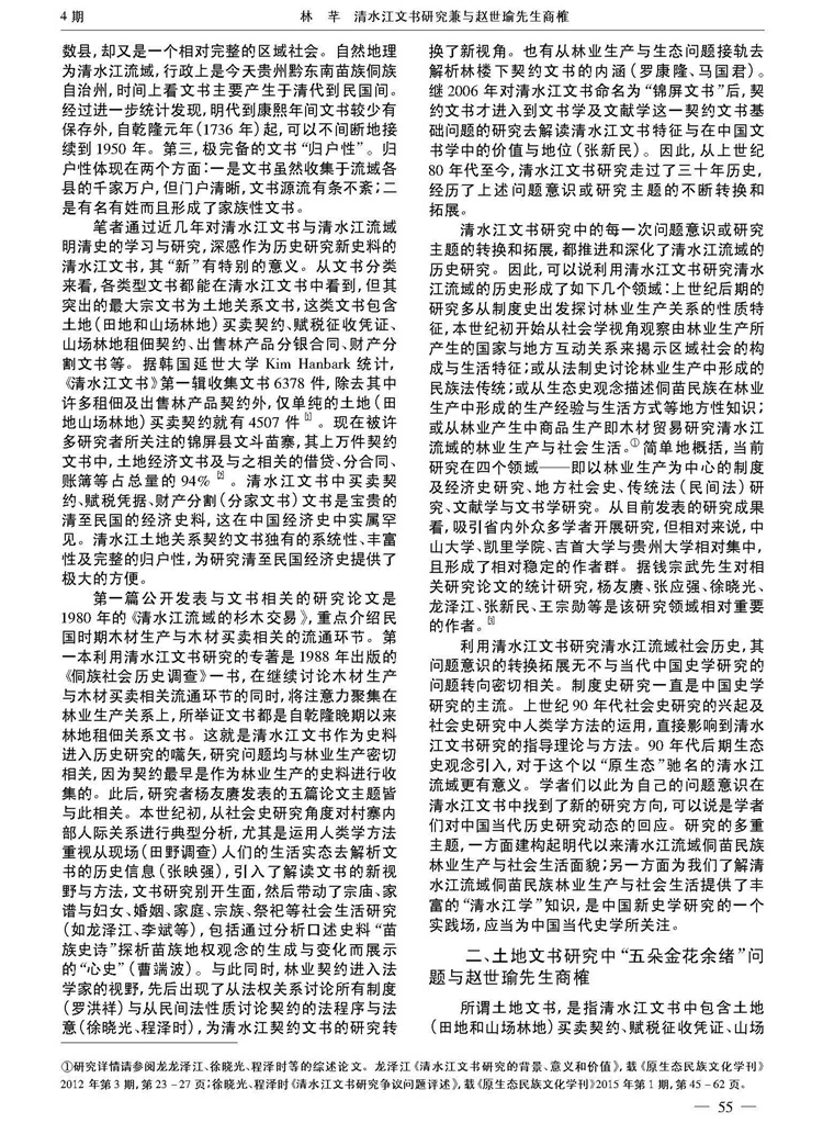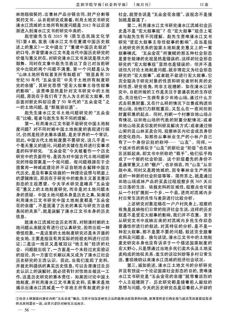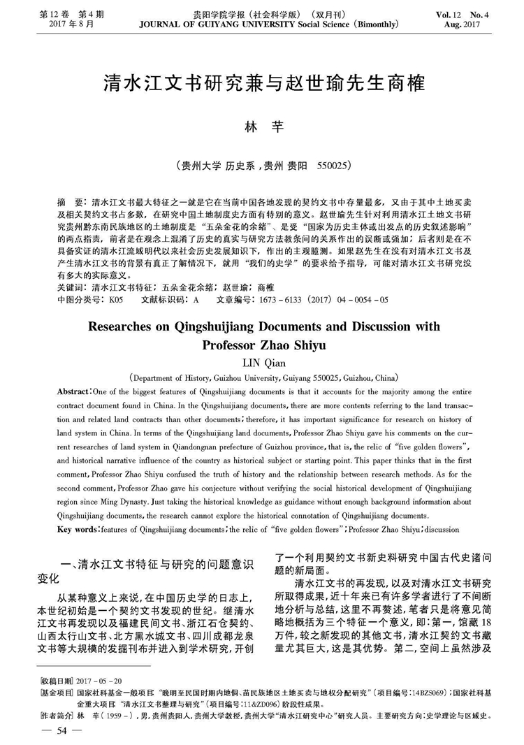 2017年8月第12卷第4期《贵阳学院学报》(社会科学版)刊载贵州大学历史与民族文化学院(中国文化书院)历史系、贵州大学“清水江研究中心”研究人员林芊教授国家社科基金一般项目“晚明至民国时期内地侗、苗民族地区土地买卖与地权分配研究”(项目编号:14BZS069)、国家社科基金重大项目“清水江文书整理与研究”(项目编号:11&ZD096)阶段性成果,题:清水江文书研究兼与赵世瑜先生商榷。全文如下: