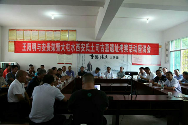 2017年9月9日,应贵州省修文县史志办、民宗局、文物管理所等单位联合邀请,由贵州大学、贵州师范大学、贵州民族大学30多位有关彝族文字学、布依学、阳明学的历史学、民族学、宗教学、考古学专家组成的考察团,前往修文县大石布依族乡大屯村,实地考察疑似水西安氏土司安贵荣墓遗址,并就王阳明与安贵荣的历史渊源以及二人在思想上的相互影响等学术问题进行深入交流探讨。