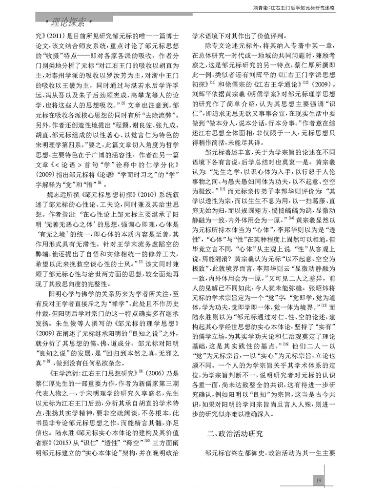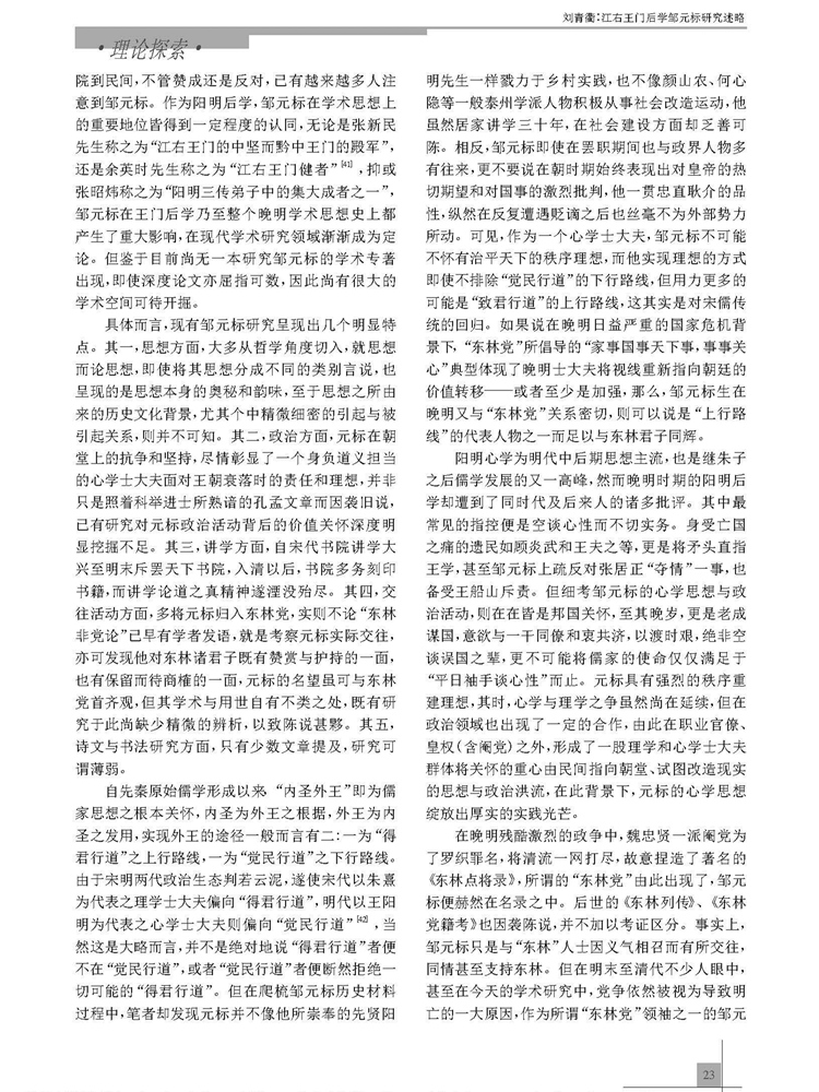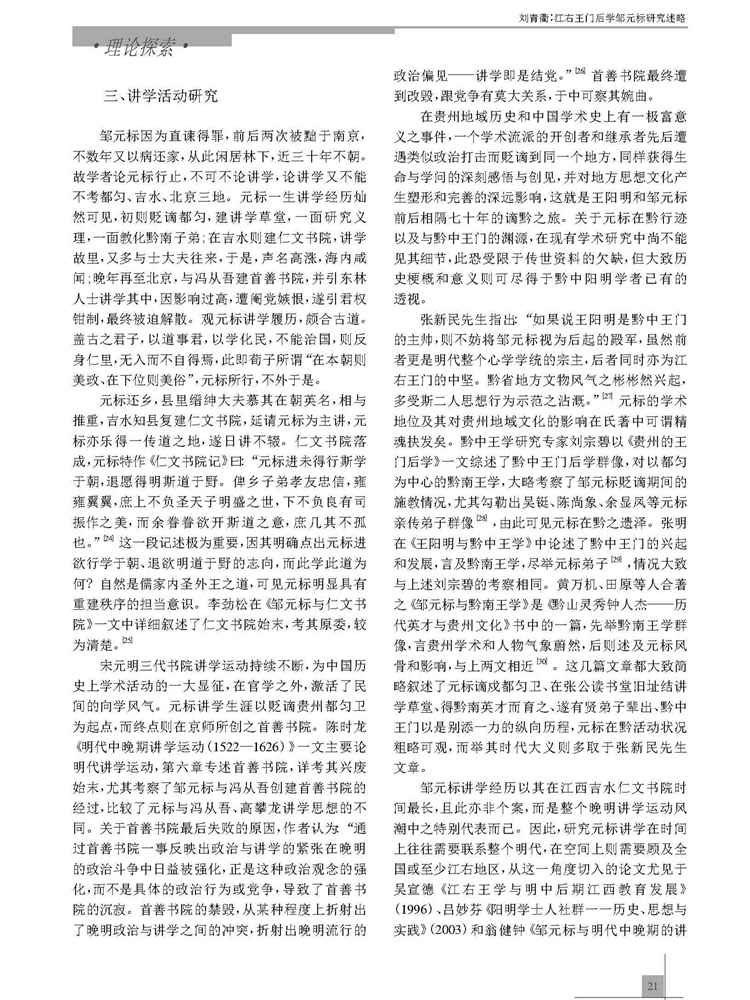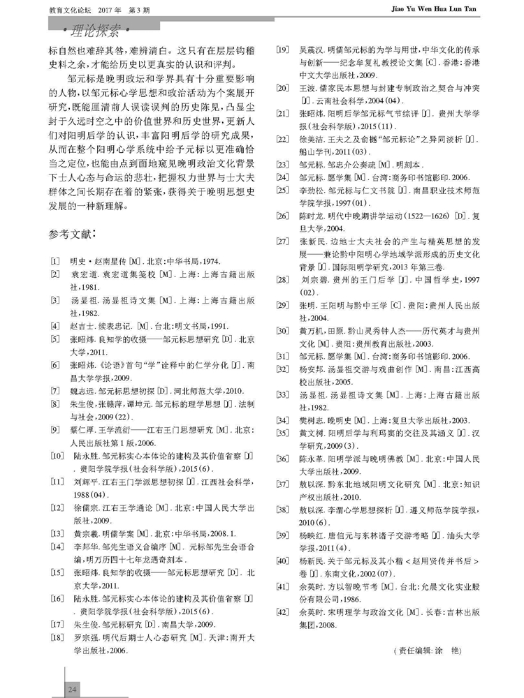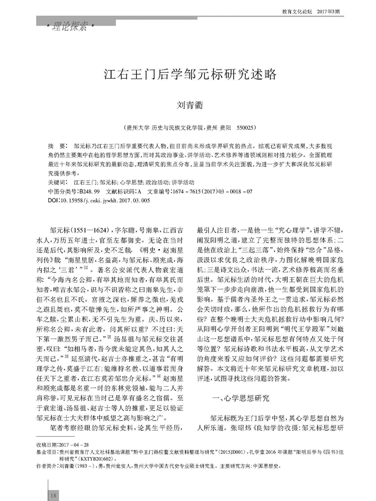 2017年第3期《教育文化论坛》刊载贵州大学历史与民族文化学院中国古代史专业硕士研究生刘青衢参与贵州大学历史与民族文化学院(中国文化书院)历史系张明副教授所主持贵州省教育厅人文社科基地课题“黔中王门孙应鳌文献资料整理与研究”(2015JD001)、孔学堂2016年课题“阳明后学与《四书》注释研究”(KXTYB201602)成果,题:江右王门后学邹元标研究述略。全文如下: