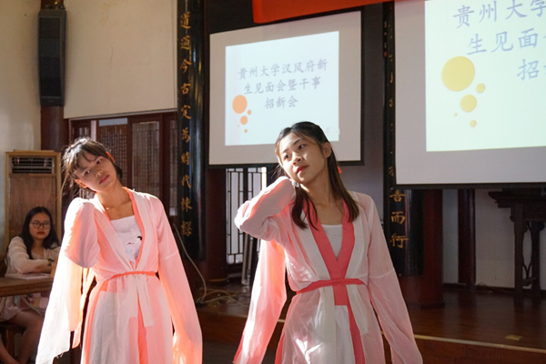 二零一七年九月二十四下午,贵州大学“汉风府”学生社团新生见面会暨干事招新会在社团挂靠单位贵州大学中国文化书院举行。本次活动由“汉风府”举办,贵州大学学生社团组织“武术协会”、“天陨动漫社”、“粤语社”等友社参加。“汉风府”参加见面会的人员有“汉风府”本届成员、“汉风府”历届学长学姐、新入社的同学们。