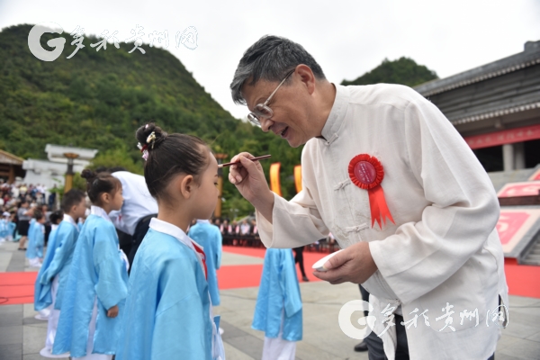 “开笔礼”篇章,正衣冠、拜先师、朱砂启智、写“人”字......,来自贵阳市的400余名小学一年级新生在庄严的传统仪式中开启人生新阶段。贵阳孔学堂文化传播中心党委书记、理事会理事长徐圻向贵阳市第一实验小学等赠送孔子行教像。