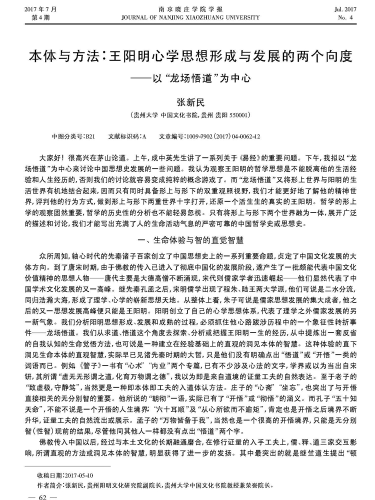 2017年7月第4期《南京晓庄学院学报》刊载贵州阳明文化研究院副院长、贵州大学中国文化书院荣誉院长张新民教授主讲“成中英新易学与管理”讲习班内容,题:本体与方法:王阳明心学思想形成与发展的两个向度——以“龙场悟道”为中心。全文如下: