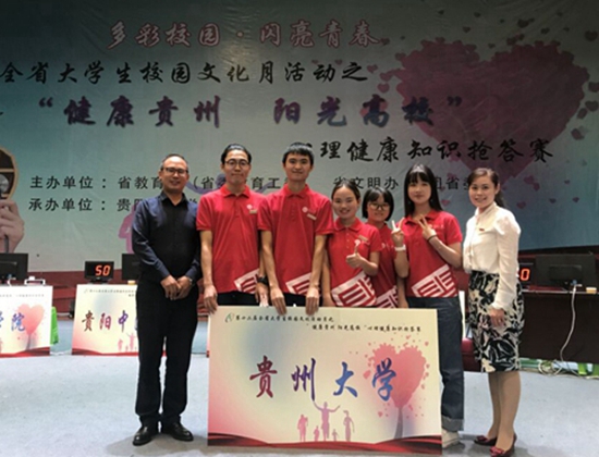 贵大新闻网讯(记者团蔡佳报道|摄影帅懿芯)在由省教育厅(省委教育工委)、省文明办、团省委主办,贵阳中医学院承办的“多彩校园·闪亮青春”第十二届全省大学生校园文化月活动之“健康贵州阳光高校”心理健康知识抢答赛中,我校代表队以总分220分的佳绩荣获二等奖。我校本次参赛代表队由团委心理老师帅懿芯带队,历史151班余鑫等五名同学组成。