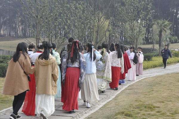 府旗飘扬,穿着汉服的游行队伍欢声笑语,绿衣黄里,红裳白裙,行走间罗裙轻摆,精美的绣花一片一片地开在姑娘们的衣角,一时间就成了校园里一道惹眼的风景。一袭袭素衣,一柄凤钗,一抹幽韵,一点腮红,一弯柳腰,吸引了许多路人合照留念。