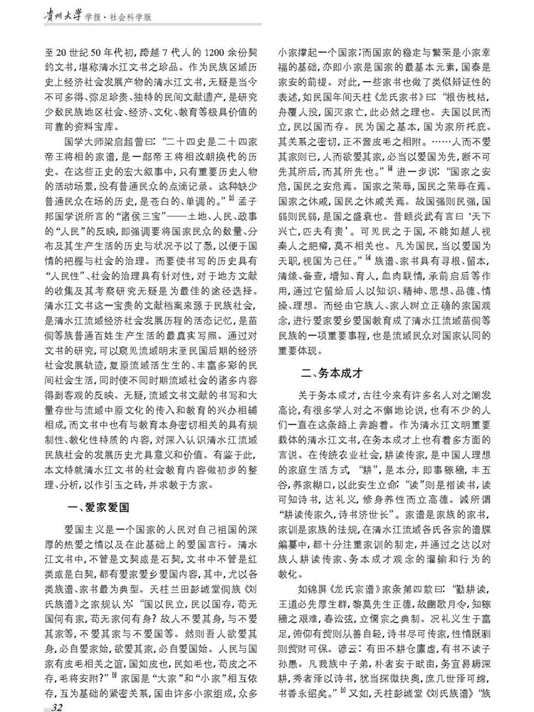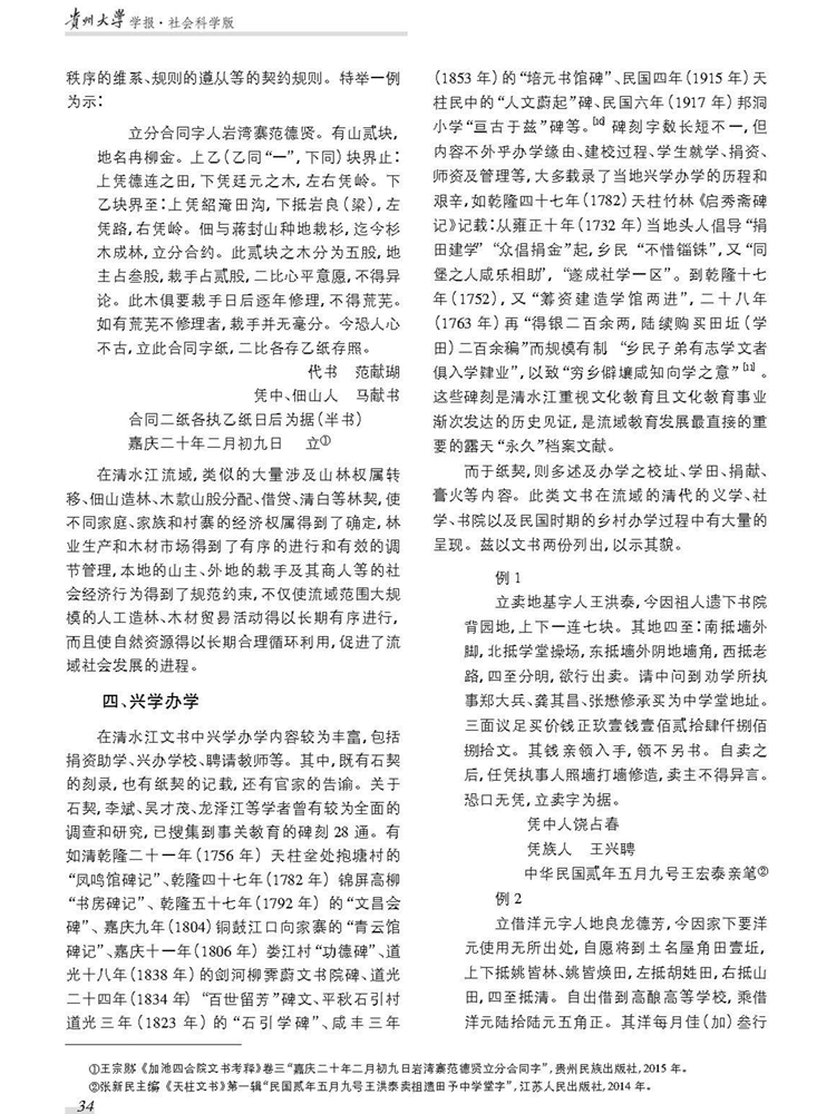 该研究为国家社科重大招标项目“西南少数民族传统生态文化的文献采辑、研究与利用”(16ZDA156)、国家民委民族研究项目“清水江流域少数民族教育文化研究”(2015-GM-139)、贵州大学文科重点学科及特色学科重大科研项目“历史与借鉴:贵州少数民族教育文化研究”( GDZT201303)、贵州省教育厅高校人文社科基地项目“清末民初清水江流域教育发展与民族社会变迁”(2016JD017)、贵州大学民族学重点学科群建设资助项目成果。全文如下: