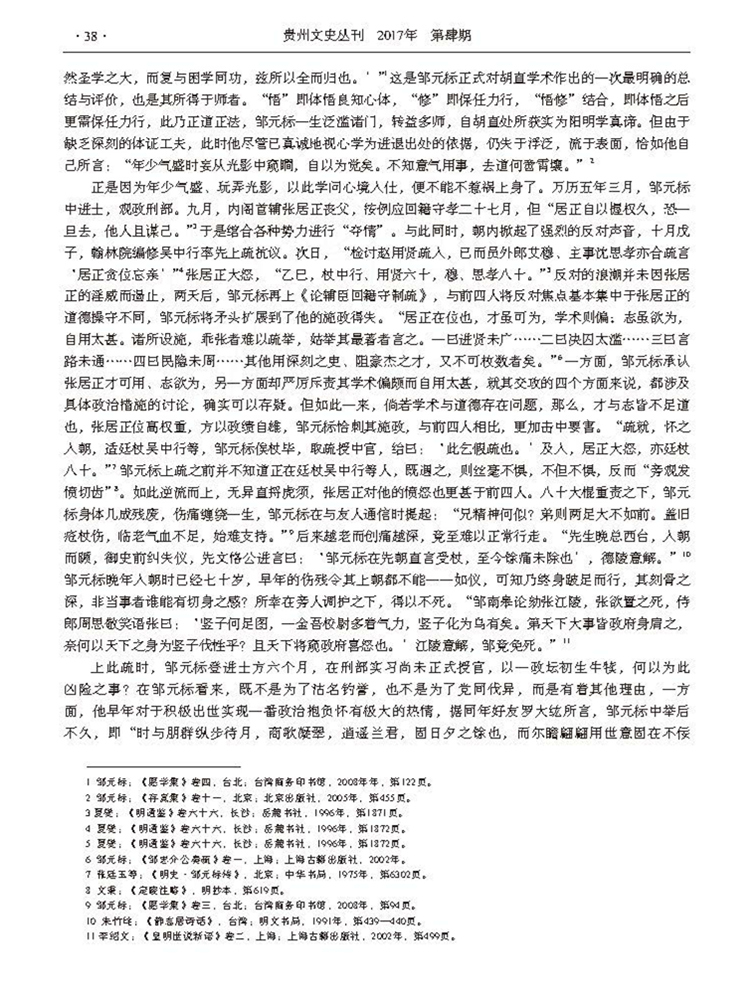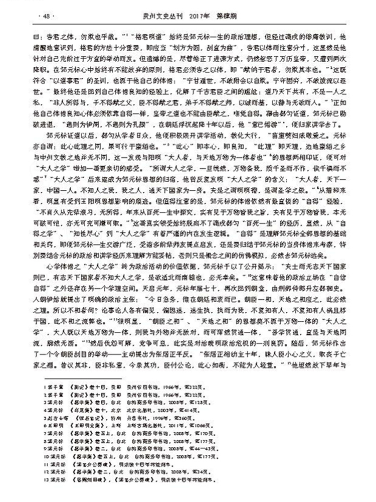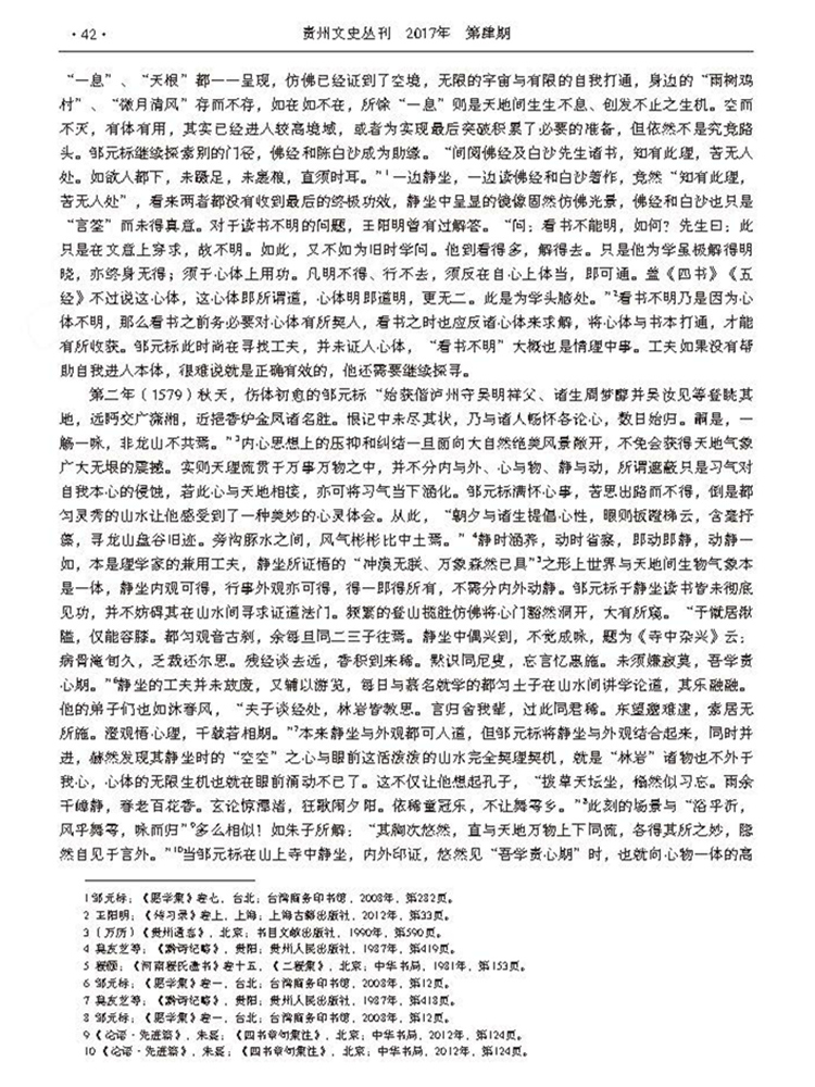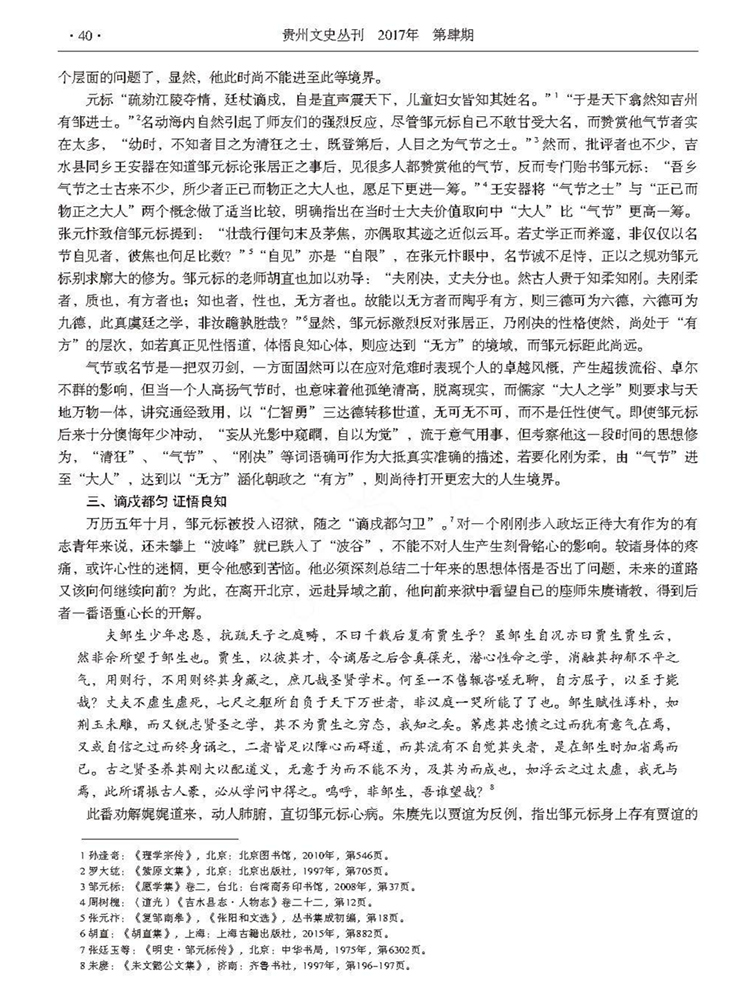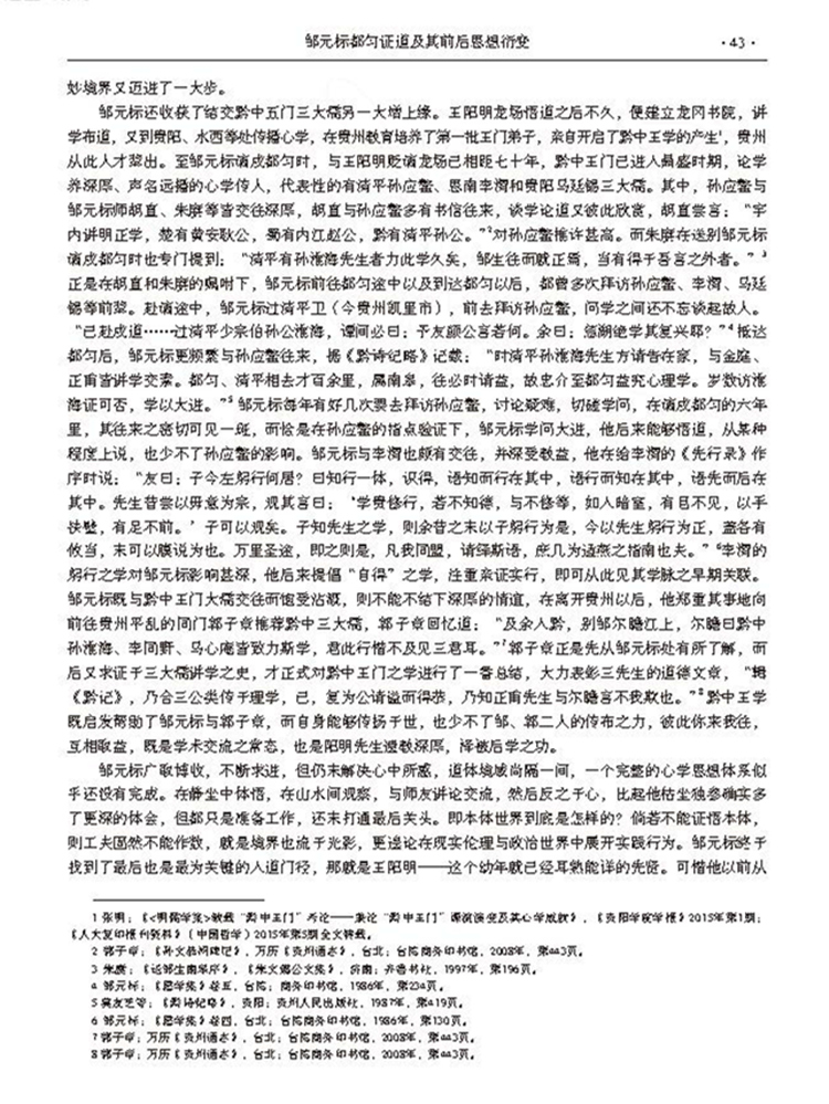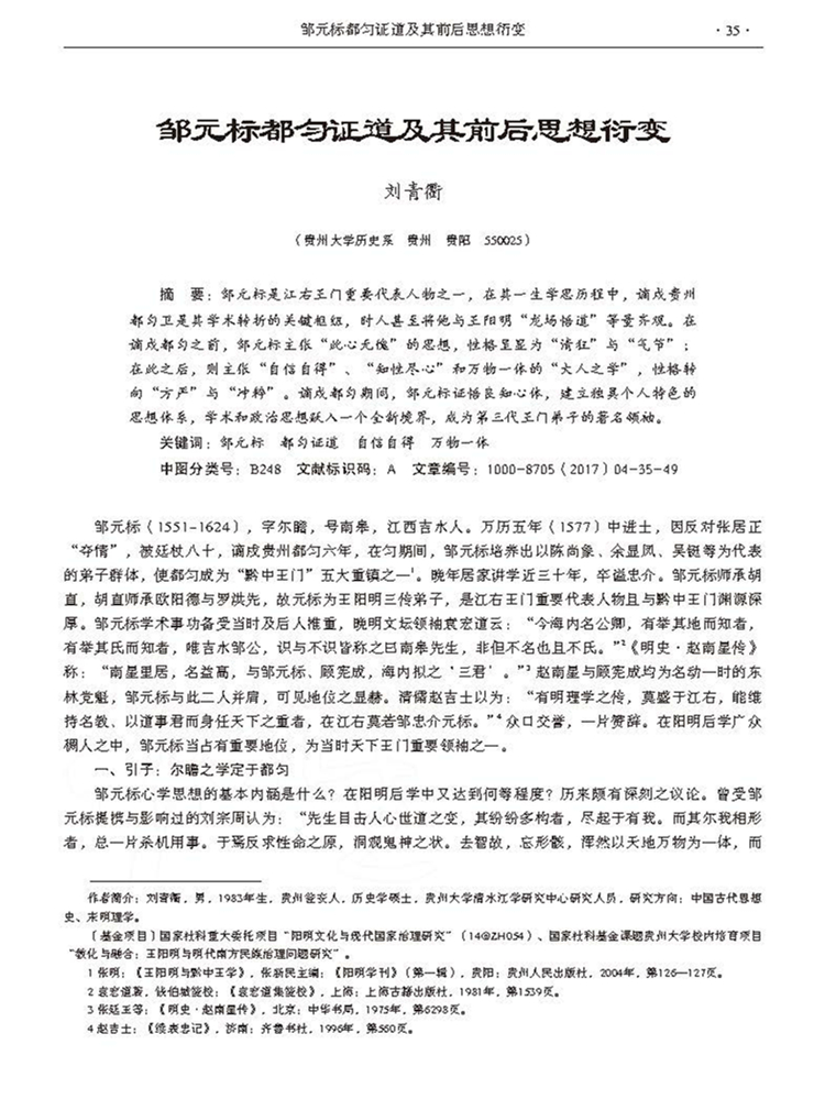 2017年第4期《贵州文史丛刊》刊载贵州大学历史与民族文化学院(中国文化书院)中国史专业毕业研究生、贵州大学清水江学研究中心研究兼职人员刘青衢关于“阳明后学”的国家社科重大委托项目“阳明文化与现代国家治理研究”(14@ZH054)、国家社科基金课题贵州大学校内培育项目“教化与融合:王阳明与明代南方民族治理问题研究”成果。全文如下: