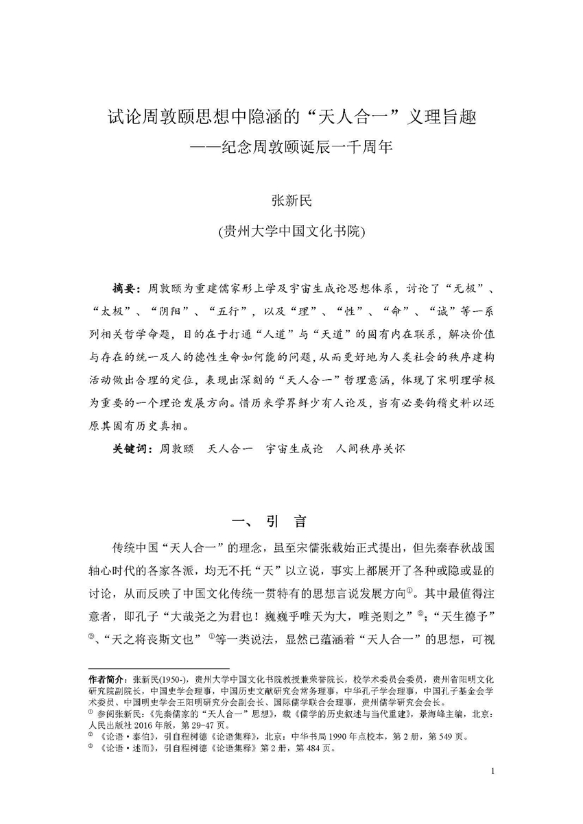 2017年第6期(总第112期)《船山学刊》刊载贵州大学中国文化书院荣誉院长、校学术委员会委员、贵州省阳明文化研究院副院长、中国史学会理事、中国历史文献研究会常务理事、中华孔子学会理事、中国孔子基金会学术委员、中国明史学会王阳明研究分会副会长、国际儒学联合会理事、贵州儒学研究会会长张新民教授2017年度国家社会科学基金艺术学项目“晚明艺术思潮与心学理论研究”(批准号:17BA020)研究成果,题:试论周敦颐思想中隐涵的“天人合一”义理旨趣——纪念周敦颐诞辰一千周年。全文如下: