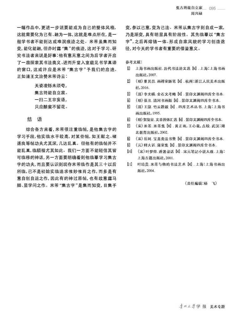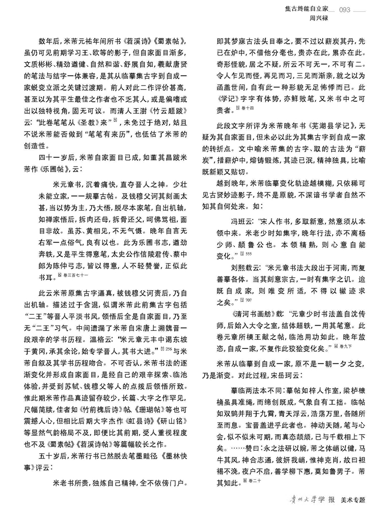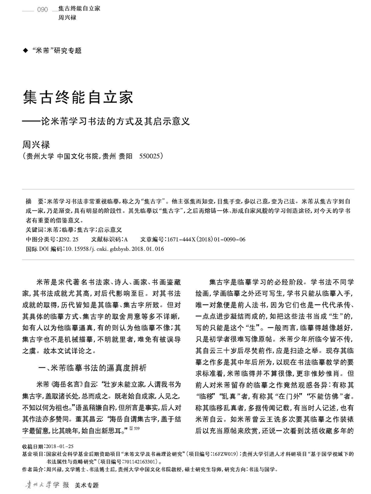 2018年第1期《贵州大学学报》(艺术版)刊载文学博士、书法博士后、贵州大学中国文化书院周兴禄教授国家社会科学基金后期资助项目“米芾文学及书画理论研究”(项目编号:16FZW019)、贵州大学引进人才科研项目“基于国学视域下的书法属性与范畴研究”(项目编号:701142163301)研究成果,题:集古终能自立家——论米芾学习书法的方式及其启示意义。全文如下:
